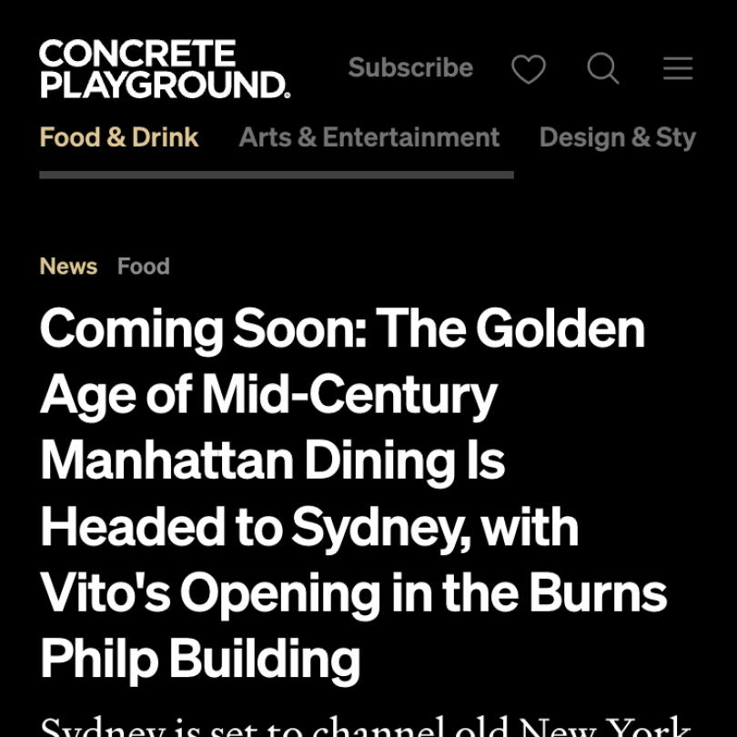 Coming Soon: The Golden Age of Mid-Century Manhattan Dining Is Headed to Sydney, with Vito's Opening in the Burns Philp Building.